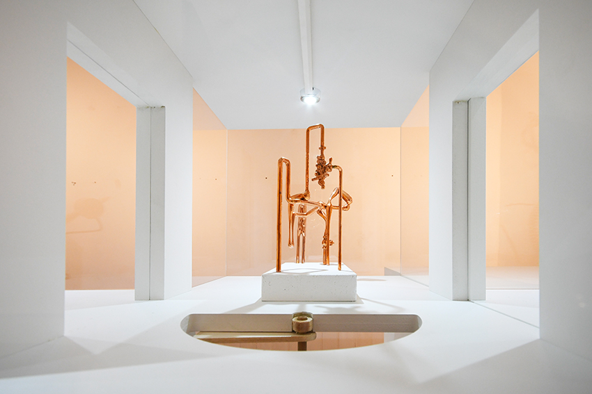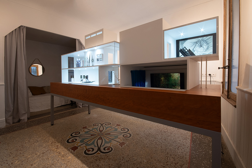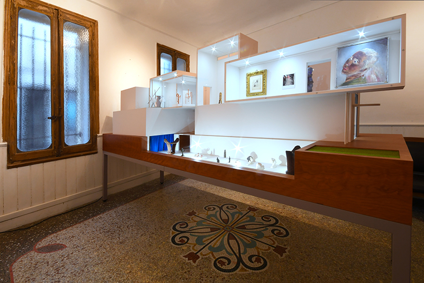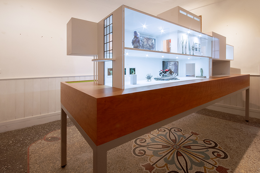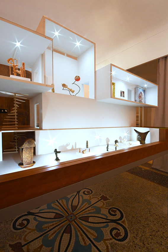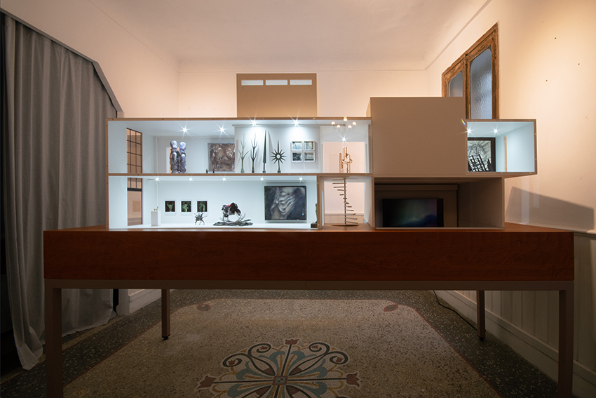 Interior and the collectors asked to the artist Le Gentil Garçon (The Nice Guy) to reactivate his miniature museum device (MUMI), produced by Le voyage à Nantes (Fr) for the artist's exhibition at Palais Dobré in 2016. Installed in one of the house's bedrooms, this work is halfway between a cabinet of curiosities and a model of modernist-inspired architecture. Change of scale and context allow a completely different perception of the artworks, with visitors' gaze varying from the omniscient vision of a CCTV camera to a tiny mouse wandering through the spaces.